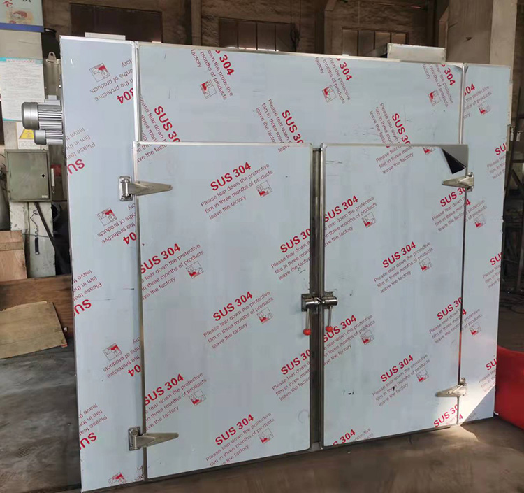 熱風(fēng)循環(huán)烘箱以空氣為載體,用蒸汽或電能或熱風(fēng)爐作熱源,將從箱外進(jìn)入的冷空氣經(jīng)過熱源加熱升溫后,再強(qiáng)制循環(huán)分層平流經(jīng)過烘盤與烘盤內(nèi)物料進(jìn)行熱交換,并帶走物料蒸發(fā)產(chǎn)生的濕氣(水分),又回到熱交換器再次加熱升溫。如此多次循環(huán),當(dāng)熱空氣濕含量增大到一定程度后就開啟排濕風(fēng)機(jī),排除部分高濕熱風(fēng),補(bǔ)充部分低溫新的冷風(fēng),從而達(dá)到連續(xù)干燥之目的。