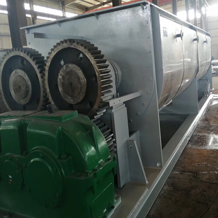 槳葉式干燥機是一種以傳導為主的臥式攪拌型干燥機。主體結構為帶有夾套的W型殼體內(nèi)裝有成對的空心低速回轉中空軸,軸上焊有若干攪拌葉片,夾套和空心攪拌葉片,其內(nèi)均通以熱載體,兩種加熱面同時對物料加熱。熱載體通常從干燥機中部送入,通過呈攪拌狀態(tài)的物料層表面,從另一側排出。