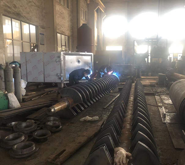 結構緊湊:干燥機主要的傳熱部件是鏟形的槳葉,這些槳葉都密集的、按照規(guī)定的間隔交叉排列在固定的旋轉軸上,因此單位容積的傳熱比較高?;谶@一原因,這種設備的結構非常緊湊、占地面積小。