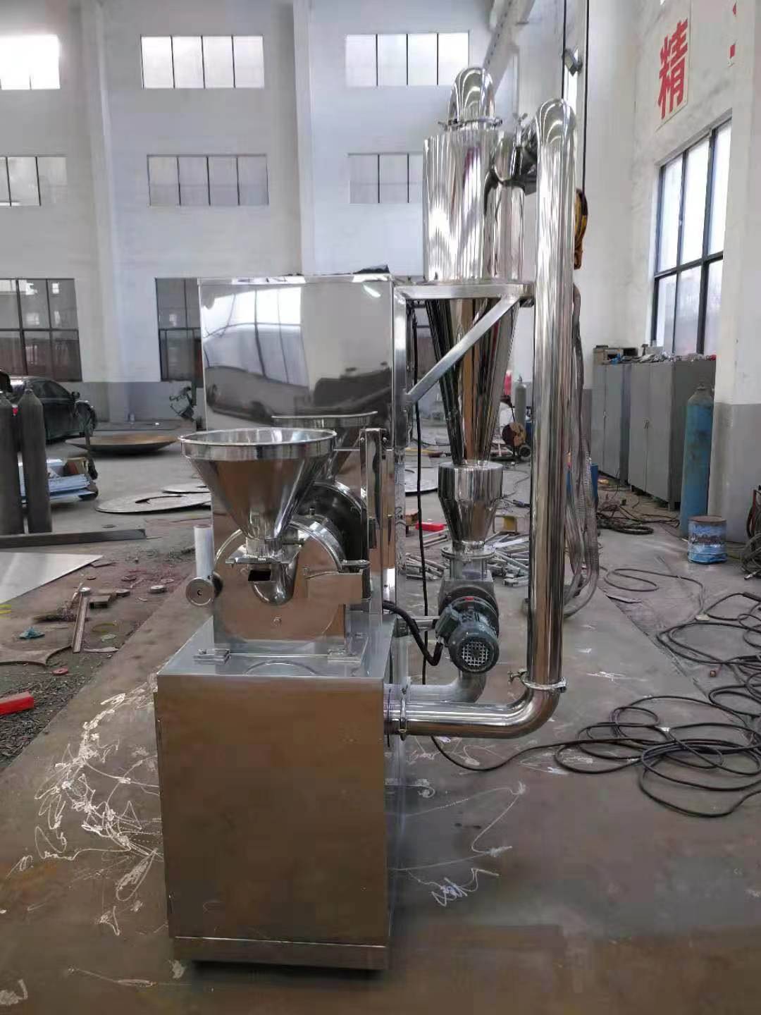 由粉碎機(jī),ESC物料收集箱和ESC吸塵器組成,解決物料在粉碎過(guò)程中粉塵飛揚(yáng)。物料進(jìn)入粉碎室,在高速旋轉(zhuǎn)的活動(dòng)齒盤與固定齒盤間受齒的沖擊、剪切、磨擦及物料間的相互撞擊的作用下被粉碎,經(jīng)篩網(wǎng)篩選后即成為所需的粉料。