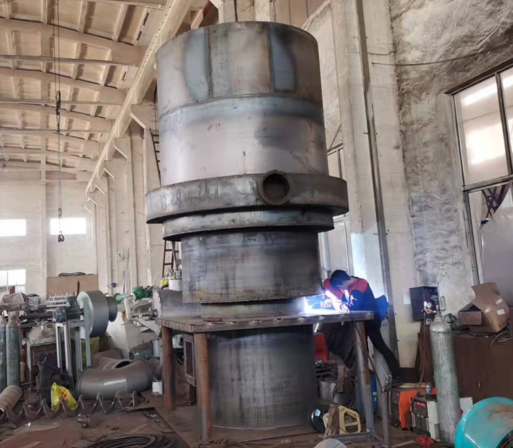 該熱風(fēng)爐的燃燒室與換熱器合為一體,采用全鋼板多層套筒多頭螺旋槽片式結(jié)構(gòu),其爐心下部為燃燒室,上部和四周為環(huán)行換熱器,空氣和煙氣均是雙回程,各行其道進(jìn)行換熱。為了提高熱效率,采用多頭螺旋槽片換熱技術(shù)和紊流原理,減薄層流厚度,使空氣和煙氣在行進(jìn)中不斷交換旋向,大大強(qiáng)化了換熱效果。主要工作過(guò)程:燃煤在爐膛內(nèi)產(chǎn)生高溫?zé)煔?,在風(fēng)機(jī)的作用下進(jìn)入煙環(huán),與外側(cè)空氣進(jìn)行熱交換后,經(jīng)煙道由煙囪排出,冷空氣由鼓風(fēng)機(jī)吹入熱風(fēng)爐外殼,經(jīng)爐頂流入爐膛外側(cè)空氣環(huán),由熱風(fēng)出口管道供給潔凈熱風(fēng)的設(shè)備。