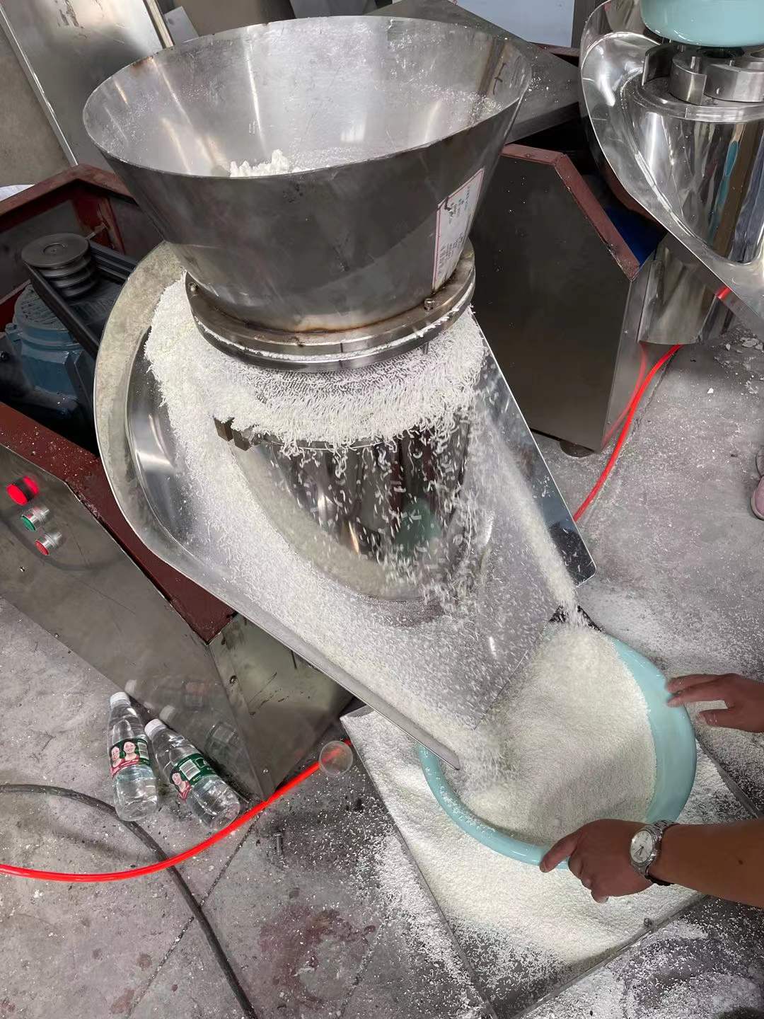 將攪拌好的物料制成所需的圓柱體顆粒,對(duì)粘性較高的物料尤為適合。該機(jī)制粒成型率高、顆粒美觀、自動(dòng)出料,避免了人工出料造成的顆粒破損,適合與流水作業(yè)操作。本機(jī)結(jié)構(gòu)合理,外形美觀,凡與物料接觸部分均采用不銹鋼制造。